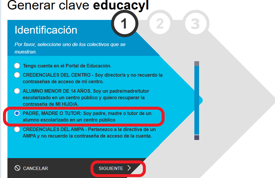 3. Ahora seleccionaremos ‘Padre/madre o tutor’ y pulsamos en ‘Siguiente’: